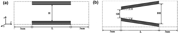 狹縫孔由半有限狹縫孔由兩個(gè)平行的石墨壁組成。每個(gè)壁包含三個(gè)石墨烯層,如圖1(a)所示?虻奶摼表示模擬框在y和z方向上的邊界。周期性邊界條件僅適用于x方向。兩個(gè)開(kāi)口端與大塊氣藏相連,每個(gè)氣藏沿y軸的長(zhǎng)度為3nm,孔隙寬度決定了z方向的尺寸。因此,通過(guò)孔內(nèi)分子與體相的相互作用,可以在孔和周圍環(huán)境之間保持機(jī)械平衡?讖紿是指通過(guò)一個(gè)壁最內(nèi)層中碳原子中心的平面與相對(duì)壁的相應(yīng)平面之間的距離。楔形孔在圖1(b)描繪了一個(gè)開(kāi)放的楔形孔及其結(jié)構(gòu)參數(shù):小端(SH)和大端(BH)的孔徑,軸向孔長(zhǎng)(L)和半角(α)?虻奶摼表示模擬框在y和z方向上的邊界。與狹縫孔一樣,開(kāi)口端周圍的氣體沿y軸的長(zhǎng)度為3nm,大端的寬度決定了z方向的尺寸。沿軸向(即,y方向)的孔長(zhǎng)度是有限的L,而在x方向上的尺寸在應(yīng)用周期性邊界條件的情況下假定為無(wú)限。