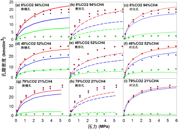 圖3:混合氣體在T=25℃在狹縫孔、楔形孔中的吸附等溫線 和理想吸附在93kPa至6.077MPa的壓力范圍內(nèi)的預(yù)測(cè)值,以及從它們的混合物中吸附的CO2和CH4。