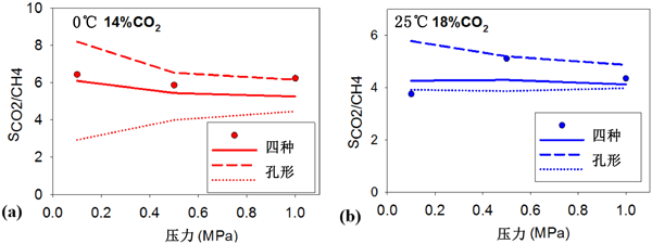 圖4:在T =(a)0℃和(b)25℃時(shí),在大約20%的二氧化碳在活性炭孔隙呢,CO2對(duì)CH4的選擇性與實(shí)驗(yàn)數(shù)據(jù)。