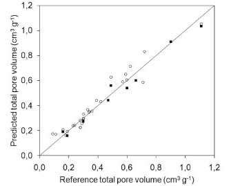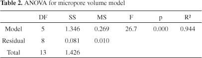 這個方程適用于微孔體積預(yù)測,用包含文獻中的數(shù)據(jù)和由我們獲得的數(shù)據(jù)的測試樣品進行評估。共測試了36個樣本。圖形比較(圖4)表明該模型具有良好的預(yù)測能力。該試驗樣品組的平均絕對誤差為0.05cm 3 g -1,平均相對誤差為16.4%。表2給出了模型的統(tǒng)計參數(shù)。