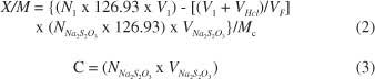 碘值根據(jù)ASTM D4607-94方法測定。碘值定義為當(dāng)濾液的碘濃度為0.02N(0.02mol L -1)時,被1.0g碳吸附的碘的毫克數(shù)。該方法基于三點等溫線。標(biāo)準(zhǔn)碘溶液在特定條件下用三種不同重量的活性炭處理。實驗包括用10.0mL的5%HCl處理活性炭樣品。該混合物煮沸30秒,然后冷卻。之后不久,將100.0mL的0.1N(0.1mol L -1)碘溶液加入到混合物中并攪拌30秒。將所得的溶液過濾并50.0毫升濾液滴定用0.1N(0.1摩爾大號-1)硫代硫酸鈉,以淀粉為指示劑。每克碳吸附的碘量(X / M)相對濾液(C)中的碘濃度繪制,使用對數(shù)軸。如果殘留碘濃度(C)不在0.008-0.04 N(0.008-0.04 mol L -1)的范圍內(nèi),則每個等溫點應(yīng)使用不同的碳質(zhì)量重復(fù)整個過程。對這三點應(yīng)用最小二乘擬合回歸。碘值是殘留濃度(C)為0.02N(0.02mol L -1)時的 X / M值。所述X / M和C ^ 值分別由等式2和3計算。