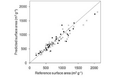 KS算法被用于分離校準(zhǔn)組和測試組中的樣品。該算法根據(jù)歐幾里德距離選擇樣本。前兩個選取的樣本彼此最遠。下面的樣本是通過與之前選擇的樣本的距離來選擇的。在校準(zhǔn)組中進行不同樣品量的校準(zhǔn)。校準(zhǔn)中使用的樣本數(shù)量被選擇來生成顯示測試組樣本的最小誤差的模型。使用最小二乘擬合來獲得校準(zhǔn)模型,以由亞甲基藍和碘值確定表面積,總孔體積和微孔體積估計。Matlab軟件被用于計算程序。