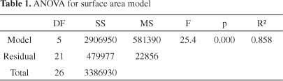 為了描述亞甲基藍和碘的數(shù)量相對于表面積的行為,使用二次模型。對于模型開發(fā),Kennard-Stone算法從105個樣本中選擇了27個樣本并用于校準(zhǔn)。樣品表面積從199到2105 m 2 g -1不等。亞甲基藍的數(shù)量在0到501毫克克每升之間,碘值從155到1670毫克克每升。建模后獲得的表面擬合(圖1)由公式4描述。