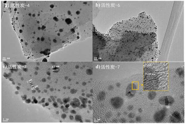 為了進(jìn)一步研究金顆粒在活性炭表面的分布和結(jié)晶度,我們拍攝了鍍金活性炭樣品的透射電子顯微鏡圖像。圖7顯示了各種活性炭樣品在不同放大倍數(shù)下的TEM圖像。圖2a、b顯示了金納米粒子在活性炭表面上的分布。很明顯,兩個(gè)樣本的分布是均勻的;钚蕴-4和活性炭-6似乎都以類似的方式相互作用和承載金納米粒子;钚蕴-7樣品的高分辨率TEM圖像如圖2c、d所示。圖2c顯示大多數(shù)金納米顆粒很小,直徑為3-5nm,并且只能看到少數(shù)團(tuán)聚顆粒。圖2d顯示了金的晶格條紋間距。發(fā)現(xiàn)晶格條紋間距為0.217nm,對(duì)應(yīng)于金晶面的面。此外,我們?cè)噲D通過TEM圖像估計(jì)顆粒尺寸的分布,我們發(fā)現(xiàn)所有樣品中超過80%的金顆粒的尺寸小于5nm。