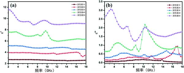 圖3:(a)載鉬活性炭-石蠟復合材料的相對復介電常數(shù)的實部和虛部,填充量從10%到50%不等。