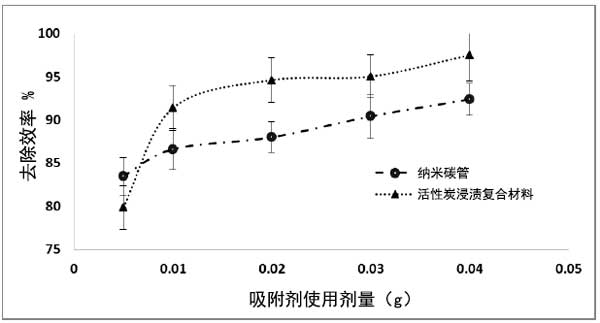 活性炭的用量是一個重要的因素,在吸附過程中起著巨大的作用。為了確定吸附劑的理想劑量,納米碳管和活性炭浸漬材料的用量從0.005到0.04g不等。圖2顯示了去除百分比(%)和不同劑量的納米碳管和活性炭浸漬材料。觀察到吸附在單位重量吸附劑上的染料量從0.005增加到0.04克。在0.04g處觀察到最大去除率,活性炭浸漬材料和納米碳管的百分比分別為97.5%和92.3%。因此,可以推斷吸附量的增加增強了活性紅的去除。顏色去除百分比的增加是由于隨著吸附劑材料的用量而增加,存在較大的表面積,這反過來又會增加反應(yīng)性空吸附位點的產(chǎn)生,使其更容易并增加離子相互作用。這些位點有利于活性紅溶質(zhì)轉(zhuǎn)移到吸附劑的外表面并提高其消除率。