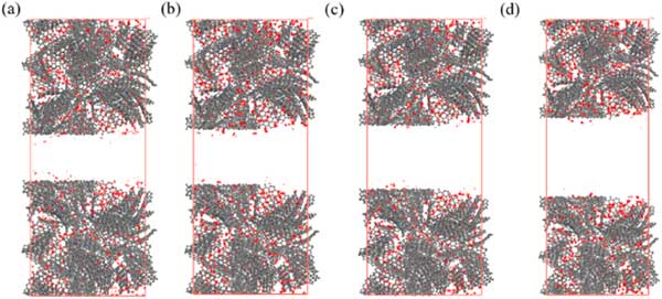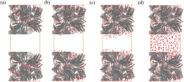 活性炭由微孔和介孔組成,介孔在一定程度上影響吸附特性。因此,研究芳烴在具有分級孔的活性炭上的吸附特性,以明確介孔對下一節(jié)吸附特性的影響。在這些模擬中,選擇了密度為0.8g/cm3的微孔活性炭,不同樣品的中孔尺寸分別選擇為2.0、2.5、3.0和4.0nm。具有不同層次孔隙的活性炭。分層孔隙活性炭模型構(gòu)建為密度在0.6-0.7g/cm3的合理范圍內(nèi)。圖3展示了苯分子在p=10kPa下具有不同中尺度孔徑的活性炭上的吸附位點(diǎn)分布。這表明即使在p=10kPa時(shí),苯的吸附也僅發(fā)生在介孔表面,而不會填充介孔的空隙空間。圖4說明了對二甲苯在具有3.0nm孔的活性炭上從低壓到高壓的吸附位點(diǎn)的變化。從圖4(a)-(d)可以看出,只有微量的對二甲苯分子被吸附到微孔上,當(dāng)壓力為1.25kPa時(shí),微孔逐漸被填滿,中孔壁上出現(xiàn)吸附位點(diǎn)。當(dāng)壓力增加到3.75kPa時(shí),吸附位點(diǎn)增加,介孔中開始出現(xiàn)多層吸附,最終介孔充滿對二甲苯,此時(shí)壓力可達(dá)6.25kPa。