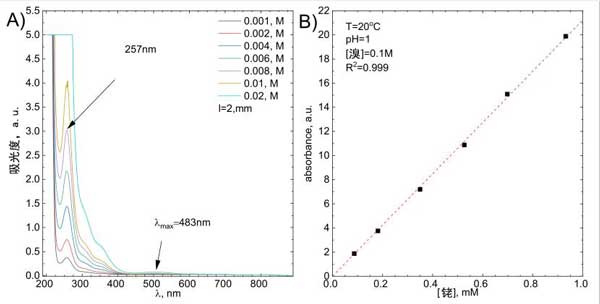 圖1:(A)研究溶液的UV-Vis光譜作為銠初始濃度的函數(shù),(B)使用圖形方法測(cè)定摩爾吸收系數(shù)。