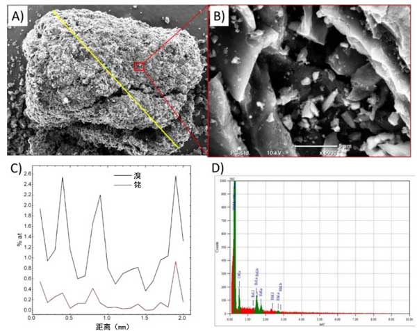 圖3:吸附試驗(yàn)后活性炭樣品的SEM圖像(A)表示進(jìn)行EDS分析的線的總體視圖,(B)進(jìn)行EDS點(diǎn)分析的區(qū)域的放大率,(C)EDS線分析結(jié)果,(D)選定點(diǎn)的EDS光譜。