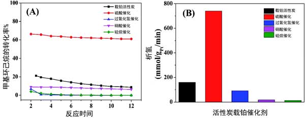 圖2:(A)甲基環(huán)己烷脫氫為甲苯的轉(zhuǎn)化曲線和(B)活性炭載鉑催化劑上的析氫直方圖。