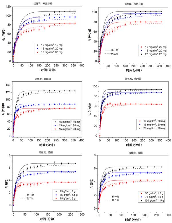 圖1:使用不同吸收濃度和活性炭用量對活性炭上雙氯芬酸、咖啡因和縮酮的動力學(xué)吸附數(shù)據(jù)。