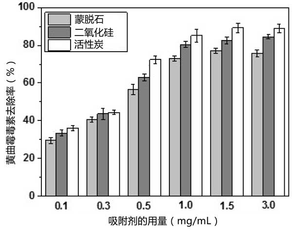 三種吸附劑對AFB1的吸附在25℃下進行24小時。圖1顯示了活性炭和其它吸附劑用量的AFB1去除率。無論吸附劑劑量如何,使用活性炭時去除率更高,其次是二氧化硅和天然蒙脫石。正如預(yù)期的那樣,AFB1的去除率隨著吸附劑劑量的增加而增加,這可以通過AFB1與吸附劑之間的相互作用增加來解釋,包括氫鍵、孔填充和靜電吸引力。吸附劑量為1.0mg/mL時,黃曲霉毒素的去除率使用蒙脫石、二氧化硅和活性炭時,分別為73.23%、80.35%和85.09%。在較高的吸附劑量(1.5mg/mL)下,去除率分別略微增加至75.56%、83.48%和89.15%。在這個吸附系統(tǒng)中,當吸附劑以較低濃度使用時,可用的吸附位點較少。因此,增加吸附劑濃度有效地增加了吸附位點的數(shù)量,從而提高了AFB1的去除率。但濃度過高時,吸附劑顆粒間會發(fā)生膠結(jié)、絮凝和團聚現(xiàn)象。這導(dǎo)致可用吸附位點的數(shù)量穩(wěn)定或減少,并且去除率沒有進一步提高。此外,當吸收劑以高濃度使用時,可能會消除維生素E和甾醇等微量營養(yǎng)素,從而導(dǎo)致營養(yǎng)流失。因此,使用濃度為1.0mg/mL的吸附劑被認為是合適的,因此在進一步的實驗中被采用。