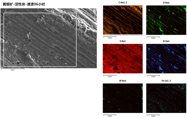 選擇在48和96小時浸出后獲得的固體樣品進(jìn)行后續(xù)表征。由于硫化物硫氧化成元素硫,形成的新物質(zhì)是硫。需要注意的是,添加活性炭和未添加碳的浸出殘渣中的硫含活性炭催化劑從硫化銅中浸出金屬量存在很大差異。浸出殘渣黃銅礦在96小時的SEM-EDS顯微照片顯示硫吸附在活性炭的表面(圖2)。這種現(xiàn)象可以在活性炭催化的黃銅礦浸出機(jī)理中發(fā)揮重要作用,抑制其表面硫鈍化層的形成,從而提高該過程的動力學(xué)。碳材料對元素硫的吸附可以簡化從浸出渣中去除硫的過程,從而減少最終礦山廢物對環(huán)境的影響。