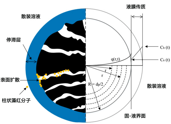 在第一實驗階段獲得的吸附平衡測試的實驗數(shù)據適合等溫線模型Langmuir、Freundlich和Redlich-Peterson。將最適合吸附平衡數(shù)據的等溫線模型的參數(shù)值應用于HSDM模型,以模擬SBA柱中的吸附過程。該模型考慮了發(fā)生在兩個連續(xù)擴散步驟中的吸附過程,即:通過活性炭顆粒周圍的固定流體層擴散(膜擴散)和通過活性炭內部孔的擴散(表面擴散),如圖2所示。