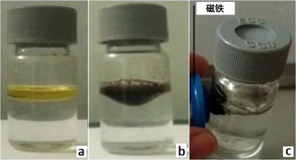 圖1:活性炭的選擇性和浮力的定量說(shuō)明:(a)機(jī)油/水混合物,(b)將活性炭添加到機(jī)油/水混合物后30秒,(c)借助磁棒去除油吸附的活性炭磁性粒子。