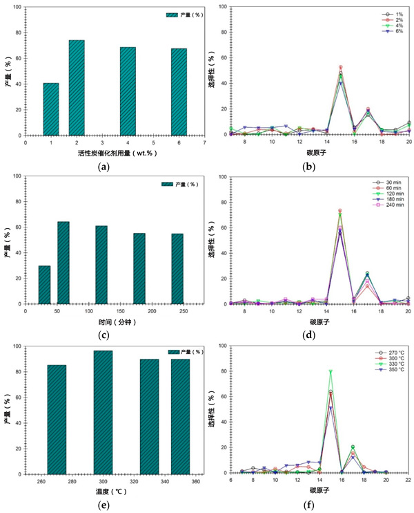 活性炭催化劑負(fù)載對(duì)烴類轉(zhuǎn)化和產(chǎn)物分化的影響如圖3a、b所示。脫氧反應(yīng)在惰性N2氣氛中在300℃的反應(yīng)溫度和500rpm的攪拌速度下進(jìn)行30分鐘。評(píng)估了催化劑負(fù)載量(即1-6wt.%)的影響。數(shù)據(jù)表明,脫氧性能和分化均在1-2wt.%的活性炭催化劑負(fù)載范圍內(nèi)升高,但隨后在催化劑負(fù)載>2wt.%后下降。產(chǎn)率和產(chǎn)物選擇性當(dāng)使用2wt.%時(shí),其效果更好,即分別為47.13%和72.85%。相反,在催化劑負(fù)載量超過(guò)2wt.%時(shí),脫氧性能和選擇性的下降可能反映了催化劑的負(fù)載過(guò)重,由于不同的活性位點(diǎn)的剩余活性位點(diǎn),這將促進(jìn)對(duì)二級(jí)和并行反應(yīng)的驅(qū)動(dòng)。
