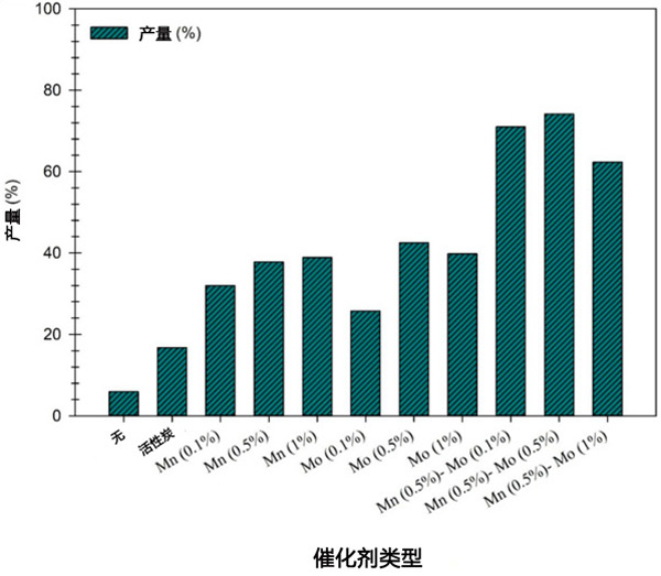 當(dāng)廢油對(duì)Mn/活性炭和Mn-Mo/活性炭催化劑樣品進(jìn)行脫氧反應(yīng)時(shí),產(chǎn)物包括液態(tài)正烷烴和烯烴,以及含氧中間體物質(zhì),例如醇,醛和酮,以及汽化的CO和CO2。單獨(dú)或兩種活性炭金屬催化劑生產(chǎn)提供了優(yōu)異的轉(zhuǎn)化和完全差異化在廢油的溶解氧過(guò)程;钚蕴看呋瘎┑姆磻(yīng)性能主要取決于Mn和Mo表面密度以及催化劑的酸度。脫氧反應(yīng)在300℃的反應(yīng)溫度和500rpm的攪拌速度下在惰性N2中進(jìn)行30分鐘氣氛。對(duì)活性炭上Mn和Mo負(fù)載百分比的篩選表明,與0.1wt.%相比,將活性炭負(fù)載0.5wt.%將烴產(chǎn)率從31.9%提高到37.9%,并將Mo負(fù)載量從0.1wt.%提高至0.5wt.%導(dǎo)致產(chǎn)率從25.7%增加到42.4%。篩選結(jié)果表明,最佳的錳負(fù)載百分比為0.5wt.%,并選擇了此百分比。Mo對(duì)Mn催化劑的影響從0.1到1wt.%負(fù)載百分比進(jìn)行了研究,結(jié)果表明0.5wt.%的Mn和Mo是合適百分比,烴收率為74%(圖2)。
