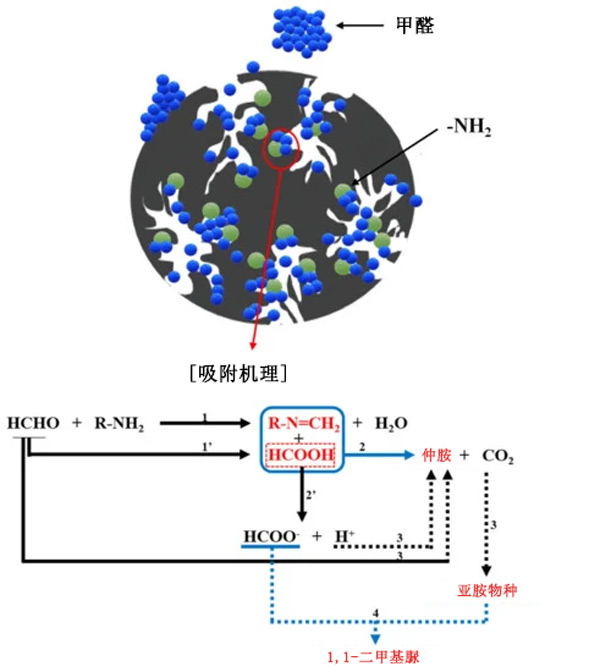 圖2:胺類在活性炭上對(duì)甲醛的作用機(jī)制。