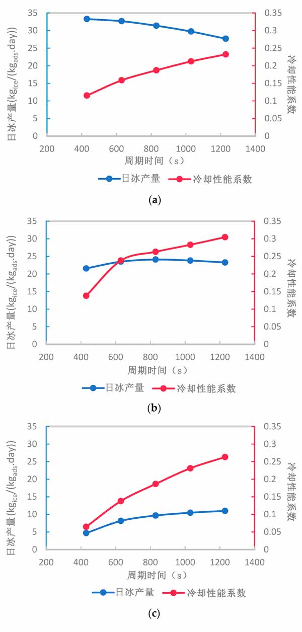 在活性炭厚度為2、5和10mm時,循環(huán)時間的變化對制冰系統(tǒng)的每日制冰量和冷卻性能系數(shù)的凈影響如圖4所示?傮w而言,在給定范圍內(nèi)增加循環(huán)時間可以增加或減少系統(tǒng)的每日制冰量,具體取決于活性炭復(fù)合材料的厚度。然而,無論活性炭復(fù)合材料的厚度如何,系統(tǒng)的冷卻性能系數(shù)通過增加循環(huán)時間而增加。盡管如此,系統(tǒng)冷卻性能系數(shù)在1230的較長循環(huán)時間和5mm活性炭復(fù)合材料厚度下達到其最大值。通過增加活性炭復(fù)合材料的厚度,日冰產(chǎn)量在不同循環(huán)時間內(nèi)的變化范圍顯著減小,這可以通過比較圖4a-c中給出的每日制冰量范圍看出。這歸因于活性炭復(fù)合材料厚度較厚時有效吸收的減少。
