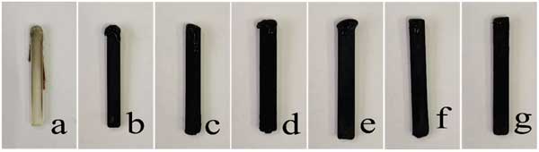 圖2:極限氧指數(shù)測試后復(fù)合材料的數(shù)字圖像:(a)聚乳酸,(b)添加活性炭3%,(c)添加活性炭6%,(d)添加活性炭9%,(e)添加改性活性炭3%,(f)添加改性活性炭6%,(g)添加改性活性炭9%。