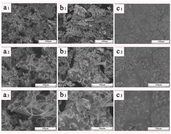 當(dāng)加載足夠的改性活性炭時,膨脹的殘余碳可以通過其質(zhì)量、連續(xù)性和致密性得到證實,這些都得到了極大的改善。一般來說,膨脹的殘余碳可以減少凝相和氣相之間潛在的熱和傳質(zhì),這反過來又會引起燃燒抑制。經(jīng)過錐形量熱儀測試后如圖4中的圖案所示,可以注意到殘留碳的顯著形態(tài)差異。在改性活性炭6%和改性活性炭9%的表面上可以看到空隙和裂口(圖4a1、b1),它們可以作為熱量的擴(kuò)散途徑,并且在燃燒過程中會揮發(fā)。此外,相比之下,改性活性炭9%在表面提供了精細(xì)的皺紋覆蓋層(圖4c1),這產(chǎn)生了有效的凝聚相阻燃性,此外,皺紋形態(tài)可以作為復(fù)合材料的增強(qiáng)框架。