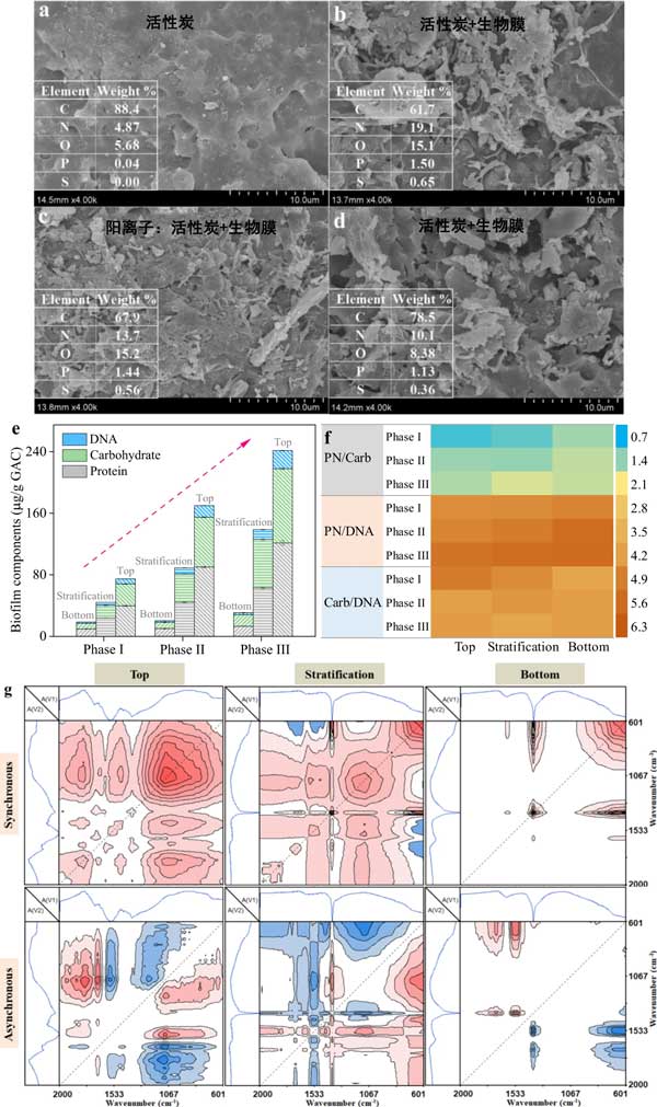 活性炭是生物膜生長的優(yōu)良載體,它可以快速從液相中吸收有機(jī)物和營養(yǎng)物質(zhì),用于生物膜中微生物的新陳代謝。圖1顯示了有和沒有生物膜的活性炭形態(tài)動力學(xué)、生物膜組分的濃度和反應(yīng)器不同位置的官能團(tuán);钚蕴恐械脑刂饕ㄌ(C,88.4%)、氮(N,4.87%)、氧(O,5.68%),以及少量的磷(P,0.04%),活性炭表面為比較順利。生物膜形成后,活性炭表面附著大量生物質(zhì),變得更加粗糙。由于生物膜中蛋白質(zhì)、碳水化合物和DNA的積累,包括N、O和P在內(nèi)的主要元素的比例顯著增加(圖1e)。值得注意的是,硫元素也被檢測到,這應(yīng)該有助于活性炭和生物膜對LAS(磺酸基團(tuán))的吸附。