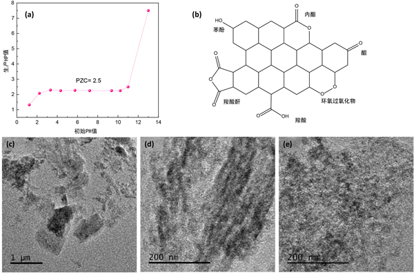 圖1:活性炭載體的研究:(a)零電荷點(PZC)的測定:反應(yīng)24小時后所得pH值作為起始pH值的函數(shù)。(b)不同含氧基團。