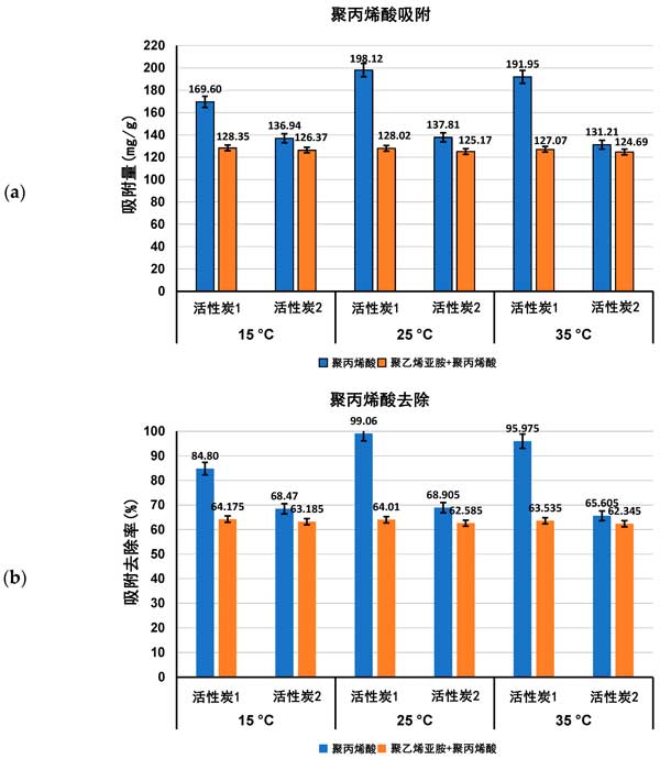 圖1:聚丙烯酸吸附量(a)及其從活性炭表面去除的百分比(b)在單一和混合吸附物系統(tǒng)中,在三個檢測溫度pH值3下。