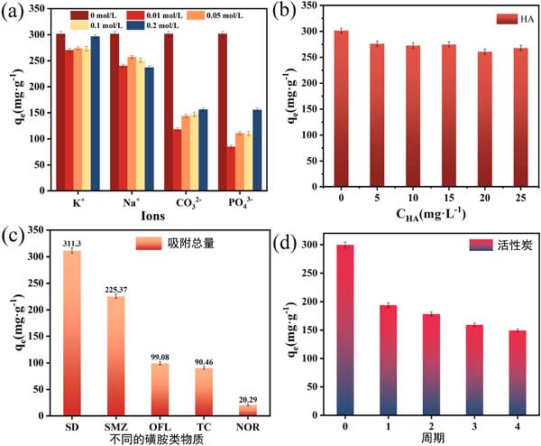 圖2:(a)腐殖酸和(b)共存離子對(duì)磁性活性炭吸收磺胺嘧啶的影響,(c)活性炭的吸附選擇性,(d)活性炭吸附磺胺嘧啶的再生性能。