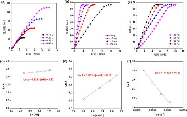 圖2:在不同的(a)氨硼烷濃度、(b)催化劑量和(c)反應(yīng)溫度下,Co0.8Cu0.2P/活性炭催化氨硼烷水解產(chǎn)生的氫氣體積與反應(yīng)時(shí)間的關(guān)系圖。(d和e)氫氣產(chǎn)生率(k)分別與氨硼烷濃度和催化劑濃度的對數(shù)圖。(f)lnk與1/T的Arrhenius圖 。
