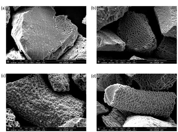 圖1:活性炭樣品的SEM圖像(a)活性炭,(b)硝酸活性炭,(c)浸有水提取物的硝酸活性炭,(d)浸有水提取物和乙醇提取物的硝酸活性炭,放大1000倍。