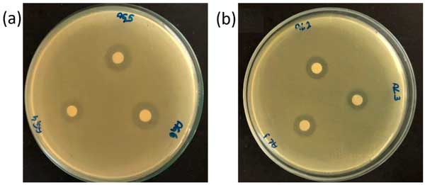 圖2:通過紙片擴散對(a)水基大蒜提取物,16±1.3mm和(b)乙醇基大蒜提取物,14±1.0mm進行抗菌敏感性測試(從10次重復獲得的平均值和標準偏差值)。