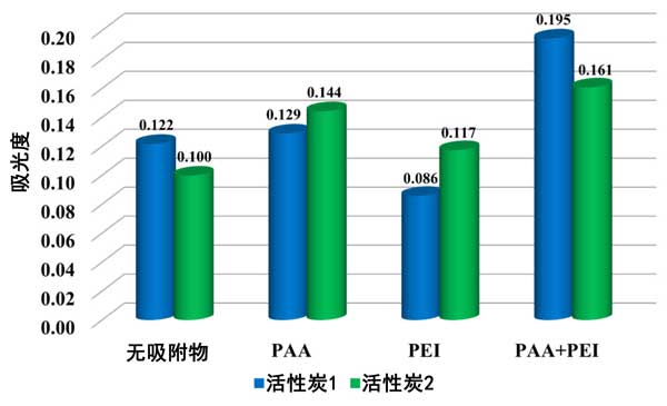 圖5:?jiǎn)我缓投劫|(zhì)系統(tǒng)中活性炭1和活性炭2懸浮液在pH3時(shí)150分鐘后的吸光度。