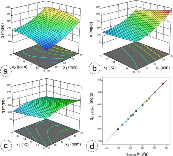 圖3:3D響應曲面圖說明了雙自變量的綜合影響(a)接觸持續(xù)時間與入口濃度(x1—x2)、(b)接觸持續(xù)時間與溫度(x1—x3)和(c)入口濃度與溫度(x2—x3)和(d)比較苯吸附的實際吸附容量(q)和預測吸附容量(q)的圖。