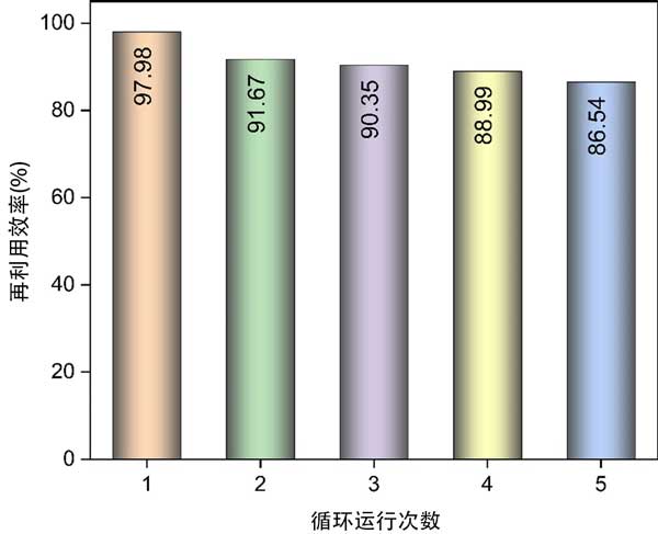 吸附劑的可重復使用性和吸附穩(wěn)定性在評估所開發(fā)方法的實際適用性方面起著至關重要的作用。事實上,吸附劑的可重復使用性能是實際應用的首要標準,并影響吸附過程的總體成本;钚蕴勘秸羝降脑倮眯适窃谖鍌連續(xù)的回收循環(huán)后確定的。如圖4所示,經(jīng)過五次連續(xù)回收過程后,活性炭苯蒸氣的再利用效率為86.54%。強大的可重復使用性和吸附穩(wěn)定性表明活性炭吸附劑和苯吸附物之間存在范德華力或π-π相互作用。相反,不完全的再生過程可歸因于吸附表面上永久鍵的形成,導致吸附基團的不可逆轉化。換句話說,一些在再生過程中未解吸的化學結合吸附物可能會堵塞孔隙,導致殘留物形成。
