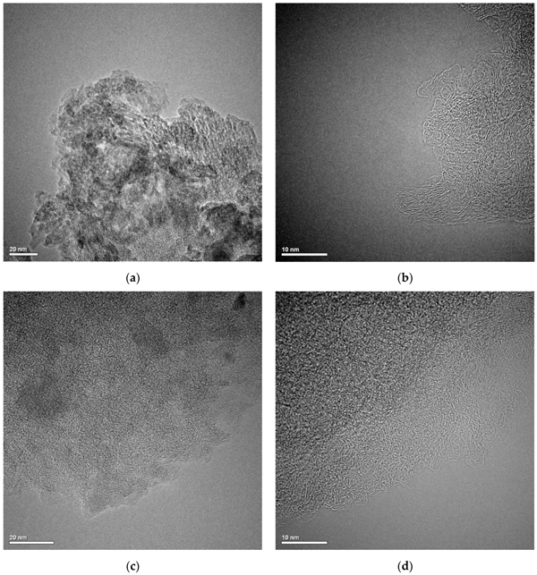 圖1:活性炭1(a,b)和活性炭2(c,d)活性炭的TEM顯微照片。