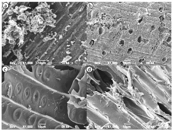 圖1a-d顯示了來(lái)自不同植物來(lái)源的活性炭樣品的形貌SEM圖像。圖像突出顯示了樣品表面結(jié)構(gòu)和孔隙率的明顯差異。圖1a顯示了粗糙的表面,表面具有高密度的不規(guī)則、未受干擾的顆粒。大量裂紋和裂縫的存在表明多孔結(jié)構(gòu)發(fā)達(dá)。圖1b顯示出類似的多孔形貌,具有廣泛的薄膜狀結(jié)構(gòu)和大空隙,表明活化和孔隙形成效率高。