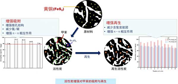研究發(fā)現(xiàn),添加0.5%的黃鐵礦能顯著提升活性炭的甲苯吸附能力和再生穩(wěn)定性。與未改性活性炭相比,改性后的活性炭甲苯吸附容量增加了17.64%,且在五個(gè)再生循環(huán)后仍能保持超過(guò)77.59%的初始吸附容量。