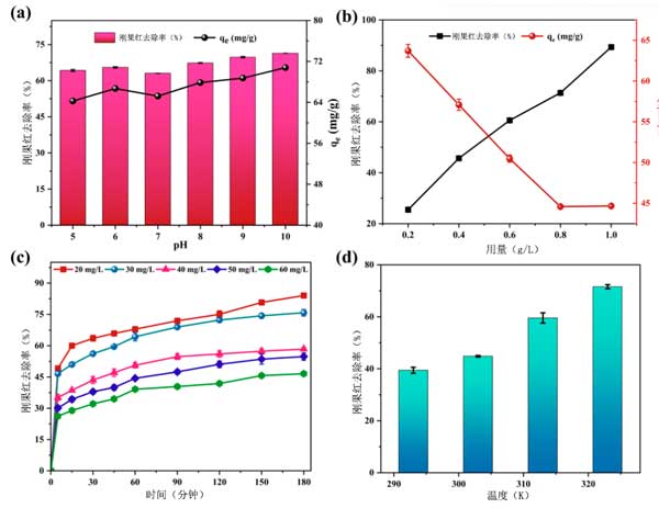 圖2:吸附參數(shù)包括(a)pH值的影響,(b)劑量的作用,初始剛果紅濃度的影響,以及(d)溫度對剛果紅在活性炭上吸附的影響。
