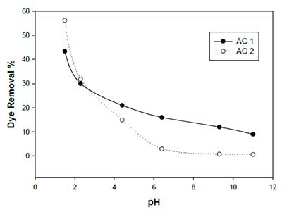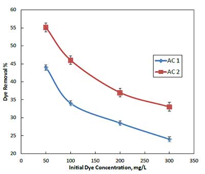 初始染料濃度在50〜300 mg L -1檸檬黃對AC1和AC2吸附效率的影響,結果如圖2所示。從圖中可以看出,隨著酒石黃初始濃度的增加,酒石黃脫除百分比降低。雖然吸附百分比隨初始染料濃度的增加而降低,但每單位質量吸附劑吸附染料的實際量隨著試驗溶液中染料濃度的增加而增加。為AC1的單元吸附從10.85增加MGG -1至35.70 MGG -1作為供試品溶液的酒石黃濃度從50 MGL增加-1至300 MGL -1。類似大號 Y,對AC2單元吸附從14.05增加MGG -1至50.1 MGG -1作為染料濃度從50 MGL增加-1至300 MGL -1。