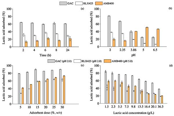 目前的研究表明,活性炭是一種好的吸附劑。然而,吸附在吸附劑上的乳酸的量不能作為選擇合適吸附劑的唯一參數(shù)。另外,活性炭的吸附能力經(jīng)過不同的吸附和解吸循環(huán)后可以降低,因此活性炭的長期性能對選擇最經(jīng)濟(jì)可行的材料至關(guān)重要。從吸附劑中解吸乳酸是一個(gè)重要的因素,需要作為下游加工策略來考察,但超出了本研究的范圍。