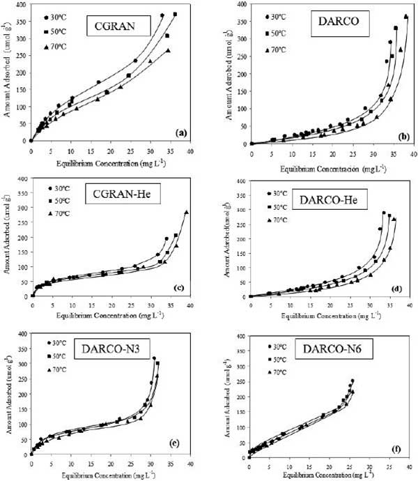 評(píng)估原樣處理的活性炭對(duì)松香酸的吸附情況,結(jié)果如圖1所示。該圖描繪了在處理前和后處理的CGRAN和DARCO活性炭的三種溫度(30,50和70℃)下作為平衡濃度函數(shù)的吸附容量。從先前對(duì)吸附速率的研究(此處未顯示),確定在30分鐘達(dá)到吸附平衡。根據(jù)分類(lèi)等溫線(xiàn),CGRAN和CGRAN-He(圖1a和1c)顯示了“L”型等溫線(xiàn),這是樅酸和吸附位點(diǎn)之間強(qiáng)親和力的特征。DARCO(圖1b)和DARCO-He(圖1d)活性炭表現(xiàn)出“S”型等溫線(xiàn),歸因于溶質(zhì)和溶劑之間競(jìng)爭(zhēng)吸附的結(jié)果,松香酸對(duì)吸附位點(diǎn)的親和力較低。圖1e和1f所示的HNO3氧化樣品(DARCO-N3和DARCO-N6)的 等溫線(xiàn)為“L”型吸附等溫線(xiàn),樅酸和溶劑之間具有強(qiáng)親和力的特征。26,27另外,DARCO-N3展示了一個(gè)被歸類(lèi)為“L2”的等溫線(xiàn),其中平臺(tái)指示表面上的所有可用位點(diǎn)均分布在單層中,并且DARCO-N6根據(jù)“L1”子群顯示等溫線(xiàn),其中沒(méi)有觀(guān)察到高原,表明未覆蓋單層。 這種行為與DARCO-N6顯示的更多的表面功能組一致。