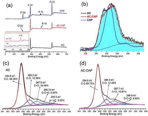 為了進(jìn)一步了解活性炭吸附氯霉素的機(jī)理,用XPS分析活性炭吸附前后的氯霉素(0.3 mmol / L)。圖2中示出了XPS測量光譜,活性炭吸附之前和之后的氯霉素的O 1s和C 1s峰。由C 1s譜確定的表面官能碳原子的計(jì)算相對含量也列于圖 2c,d中,并且計(jì)算的原子比率總結(jié)。主要的C 1s峰符合以下組的五條曲線:286.6eV的石墨結(jié)構(gòu),286.2eV的CO(苯酚,醇或醚基),287eV的C = O(羰基和醚基),O = 288.7eV處的CO(羧基或酯基),并且在290.5eV處π->π*躍遷。