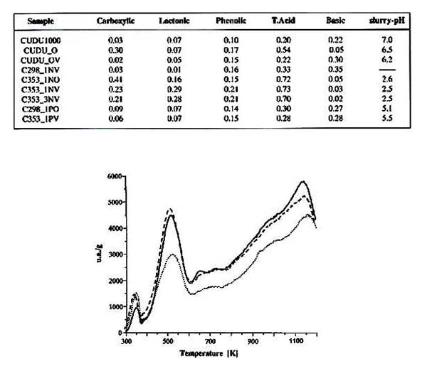 圖1顯示了過氧化氫處理后產(chǎn)生的活性炭的化學行為。從上面看出的氧化過程增加了活性炭的總酸度,并且與羧基和酚類基團的增加一致。此外,TPD曲線顯示了放出氣體的增量,峰值集中在與活性炭相同的溫度。低溫和高溫分解組的面積總體增加歸因于羧基-內酯類結構和后面的酚類基團。H2O2氧化碳的FT-IR光譜在1542和1190cm-1處顯示帶就像那些原始的碳,但后來的孔隙已經(jīng)擴大,顯示出C-O伸展模式的增加?傊,這些研究表明僅在H的性質的小變化H2O2處理過的碳,即,是在氧化時,其類似于由其他研究人員報告的行為沒有觀察到變化顯著。其中過氧化氫溶液的氧化作用明顯地看作羧酸類基團的重要減少,伴隨著堿性基團的大量增加。