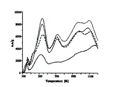 分析表明25℃下的反應只產(chǎn)生很小的變化,所以在低溫下HNO 3溶液主要以酸的形式反應,只對活性炭產(chǎn)生微小的改變。然而,在80℃下的活性炭反應顯示與HNO 3的氧化作用有關的主要變化,如活性炭中總表面基團的總體增加和羧基類似基團的最大形成。另外,由樣品的堿度降低可以解釋為6M硝酸溶液處理3小時后堿性基團的延長氧化的結果。圖2顯示了這些活性炭的TPD曲線,觀察到新峰的存在,給出了碳的化學組成的變化,即氧化基團的增量。硝酸改性碳的元素分析表明,由其他人觀察到,增加氮含量可以歸因于硝基(NO 2)形成的影響。