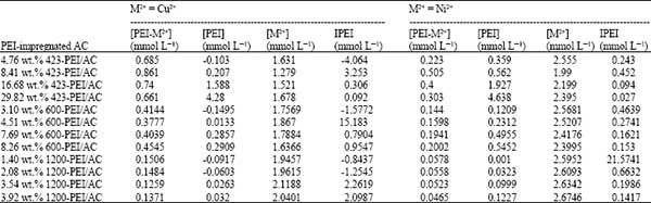 為了進(jìn)一步闡明聚乙烯亞胺浸漬量對(duì)活性炭上金屬離子平衡吸附容量的影響,本文計(jì)算和比較了PEI浸漬AC上重金屬離子吸附的相互作用參數(shù)(表示為PEI)。應(yīng)該指出的是,I PEI不等于絡(luò)合常數(shù),只計(jì)算比較重金屬和PEI浸漬的活性炭表面之間的相互作用程度。