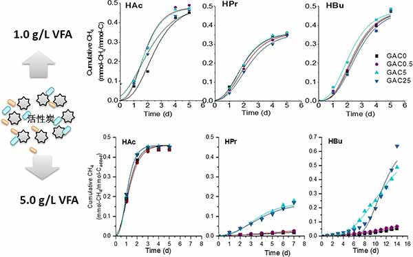 活性炭對生產(chǎn)甲烷的作用,活性炭可以促進有機廢物產(chǎn)生甲烷,這個已經(jīng)有很多人研究證實過了。在本研究中,將不同的活性炭劑量0,0.5,5和25g/L添加到厭氧消化器中,并且分別表征乙酸鹽,丙酸鹽和丁酸鹽的產(chǎn)甲烷降解動力學。在5g/L的高有機負荷下,丙酸和丁酸的降解率在不同的活性炭劑量下增加1.5-4.7倍和2.5-7.0倍。甲烷生產(chǎn)率當丙酸和丁酸的添加量增加到5g/L時顯著升高。然而,對于1g/L或5g/L的乙酸鹽降解,僅發(fā)現(xiàn)少量增加。活性炭促進丙酸鹽和丁酸鹽的協(xié)同降解的促進機制可以主要歸因于對乙酸生成的觸發(fā)作用,正如互變細菌富集證明了這一點。