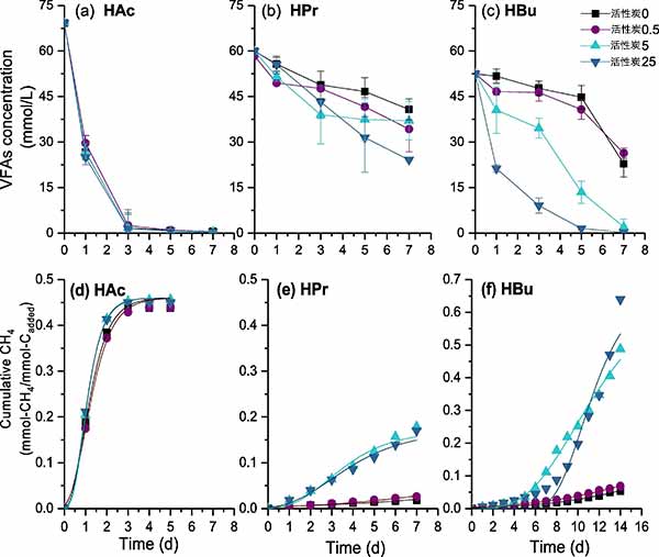 圖2。使用不同劑量的活性炭降解5g/L VFA(a-c)和相應的甲烷生產(chǎn)(eh)。