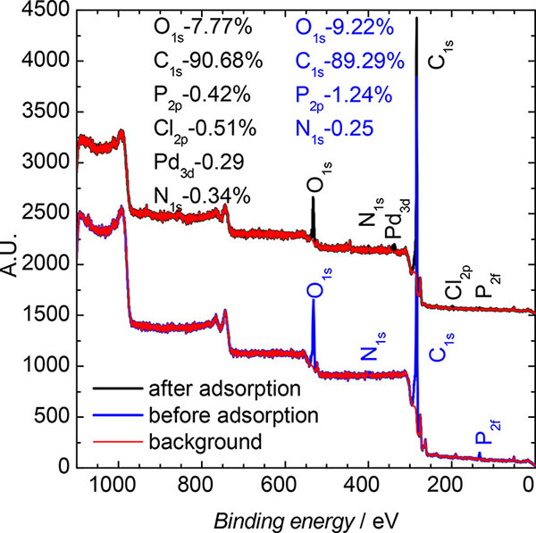 吸附過(guò)程之前和之后材料的完整XPS光譜如圖2所示?紤]到觀(guān)察到的溶液中Pd(II)濃度的降低,估計(jì)鈀負(fù)載等于0.7%(m/m)。可以看出來(lái)自鈀的峰出現(xiàn)。對(duì)這個(gè)峰值進(jìn)行更深入的分析可以為我們提供有關(guān)鈀電子結(jié)構(gòu)的信息。