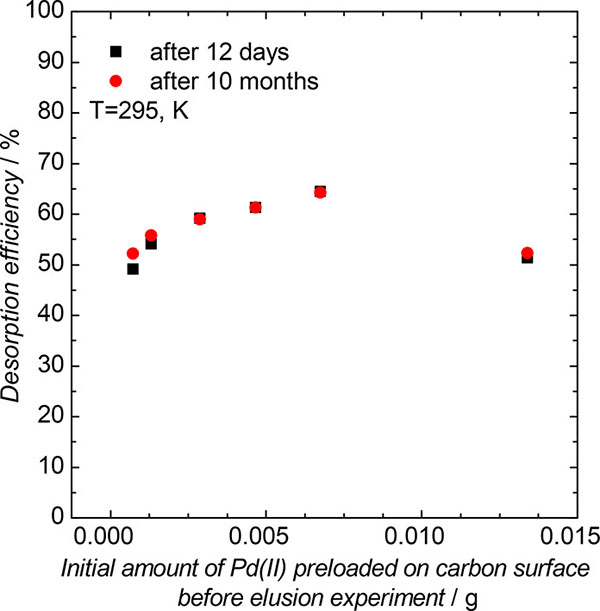 在活性炭表面存在二氯化鈀的情況下,應(yīng)該可以根據(jù)方程解吸它。因此,解吸試驗(yàn)在室溫(20℃)進(jìn)行,使用100厘米3鹽酸(濃度為1mol·kg-1)或100厘米3的高氯酸鹽酸(濃度1mol.kg-1)。必須提及的是,吸附實(shí)驗(yàn)在pH等于1下進(jìn)行,而汽提過(guò)程在pH等于0下進(jìn)行。由鈀(II)負(fù)載的活性炭樣品取自先前的吸附實(shí)驗(yàn)。通過(guò)過(guò)濾將預(yù)加載的活性炭與溶液分離,然后在60℃下干燥。接著,將干燥的預(yù)加載的活性炭與鹽酸溶液混合。解吸試驗(yàn)進(jìn)行約10個(gè)月。在前2天,觀(guān)察到溶液中鈀(II)濃度的快速增加,最終在12天后獲得恒定值。這些結(jié)果如圖4所示作為黑色方塊。為了確保這確實(shí)是最終的平衡,樣品在接下來(lái)的10個(gè)月內(nèi)留在溶液中。在此時(shí)間之后獲得的值顯示為紅點(diǎn)。過(guò)量的鹽酸是顯著的,它應(yīng)該足以溶解二氯化鈀。結(jié)果表明,平衡狀態(tài)不受時(shí)間影響,表明觀(guān)察到的狀態(tài)是最終狀態(tài)。似乎在該實(shí)驗(yàn)期間,只有約50-65%的鈀(II)物質(zhì)可以從活性炭表面洗脫。如上所述,施加過(guò)量的鹽酸。因此,一方面,不完全洗脫可以通過(guò)Pd2 OCl2的形成來(lái)解釋或活性炭表面上的另一種鈀(II)化合物。另一方面,它可能僅僅與出現(xiàn)與初始狀態(tài)不同的新平衡狀態(tài)有關(guān)。為了切斷推測(cè),進(jìn)行簡(jiǎn)單的第二次解吸試驗(yàn),其中使用來(lái)自第一次解吸試驗(yàn)的活性炭。實(shí)驗(yàn)條件和程序與第一次解吸試驗(yàn)期間的相同。觀(guān)察到鈀(II)的洗脫再次發(fā)生。在最初的24小時(shí)后,高達(dá)17%的剩余鈀(II)被解吸,而在2個(gè)月后,總解吸效率達(dá)到98.4%的水平。